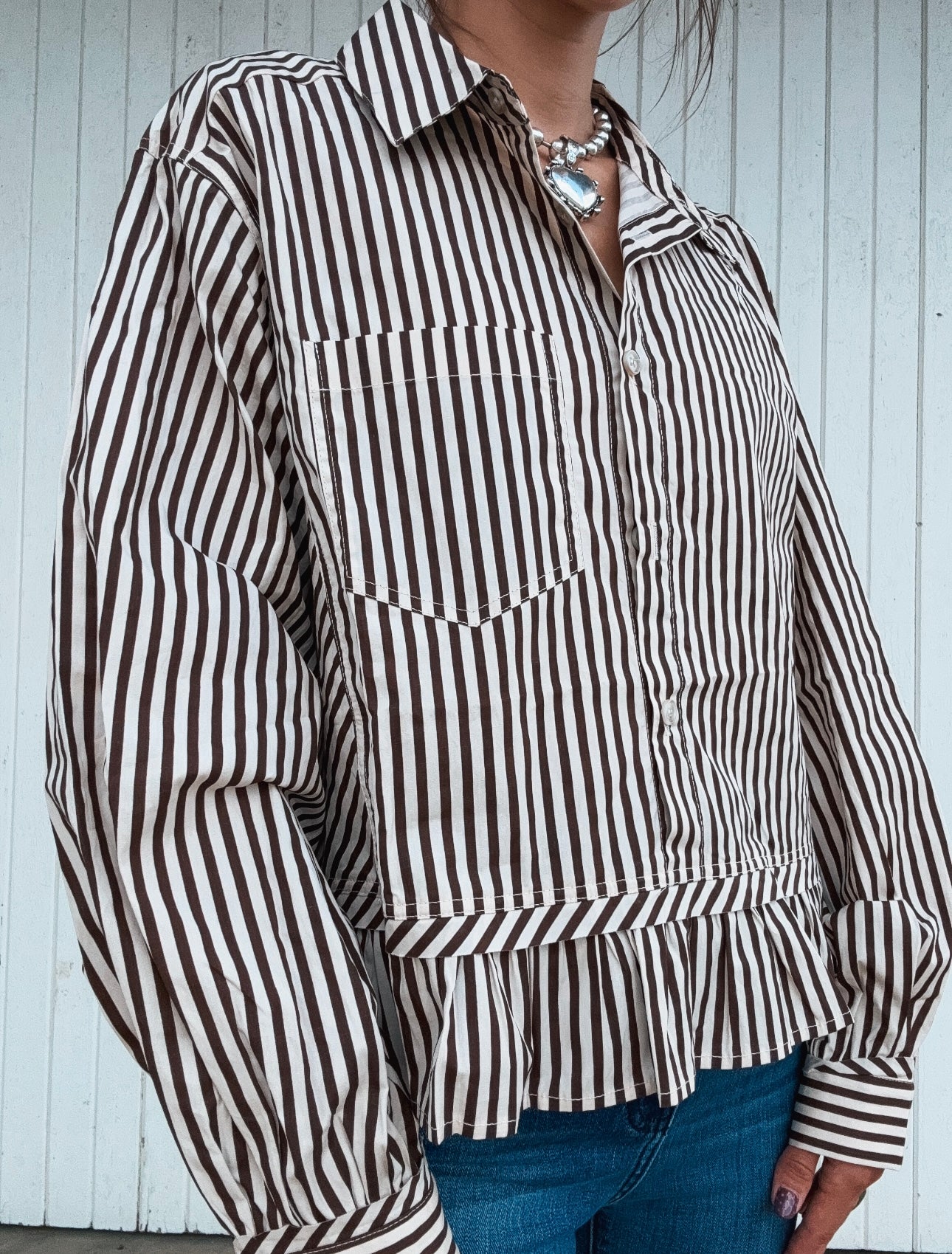 Keep it cute and classy with this mocha stripped button up. The ruffle bottom adds such an adorable touch.