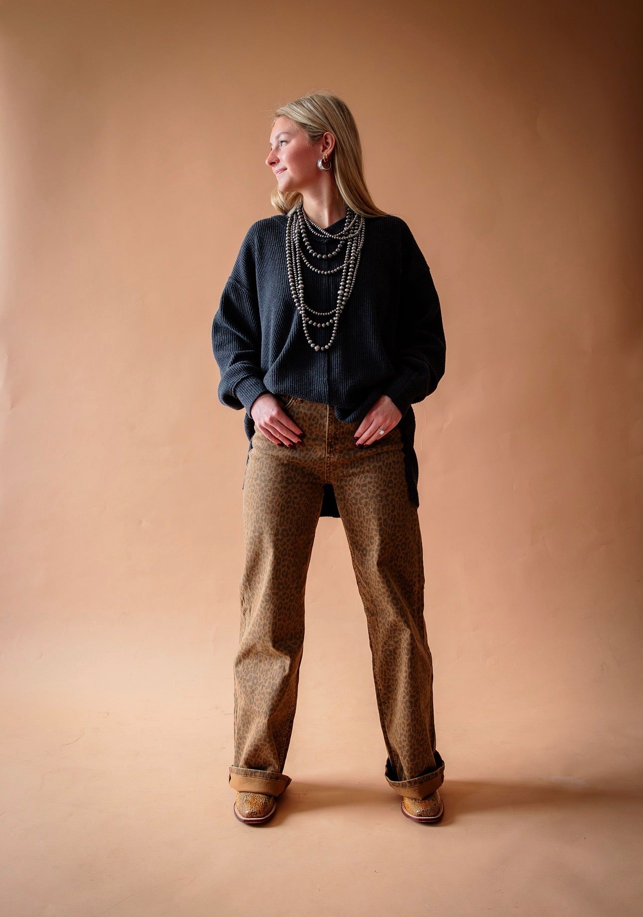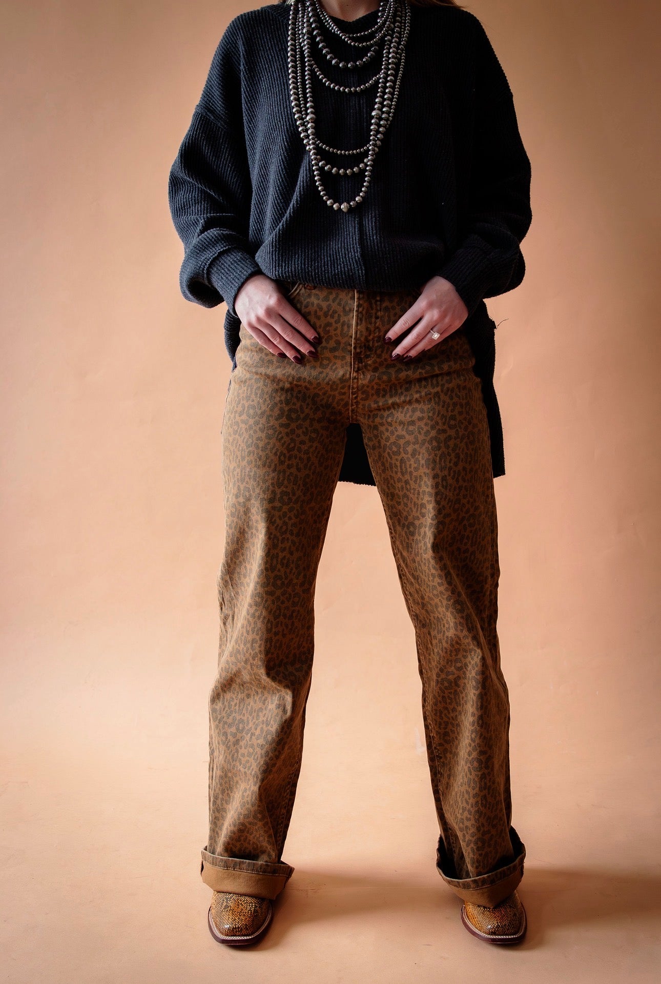 These jeans are amazing! They are a neutral brown derby cheetah print with the perfect amount of stretch. The style is high rise & wide leg.